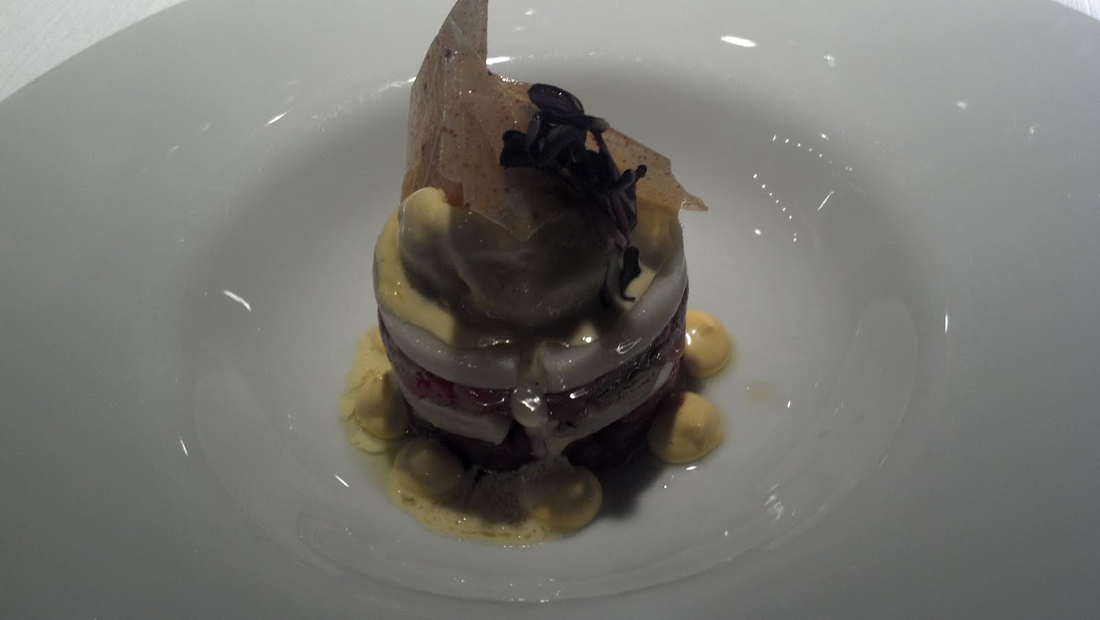 Crispy cylinder of angel hair pasta with Buffalo mozzarella cream over a liquid salad of Ferrisi beefstake tomatoes and a light Sicilian pesto (yes, I had this for lunch too hehe)